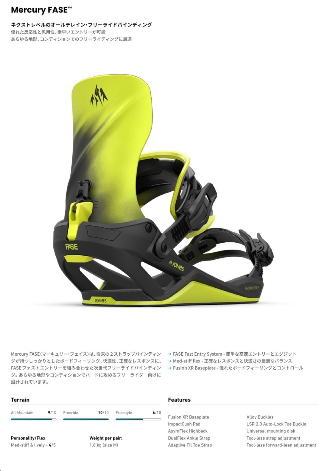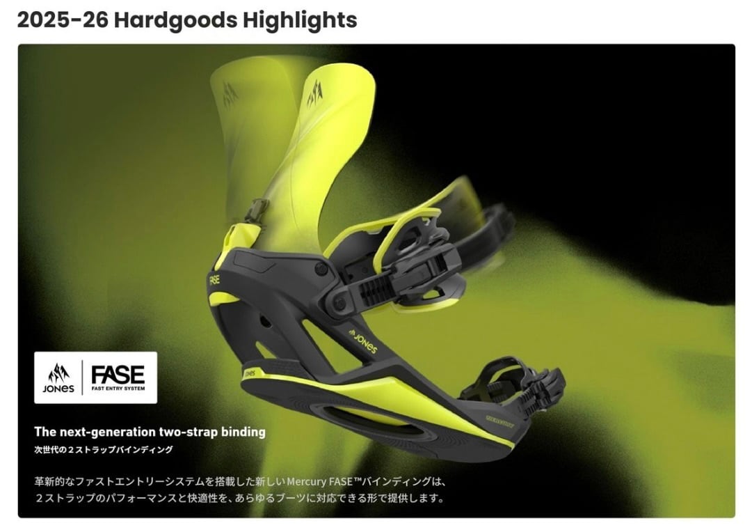 Mercury FASE(マーキュリー・フェイス)は、従来の2ストラップバインディングが持つしっかりとしたボードフィーリング、快適性、正確なレスポンスに、FASE ファストエントリーを組み合わせた次世代フリーライドバインディング。あらゆる地形やコンディションでハードに攻めるフリーライダー向けに設計されています。